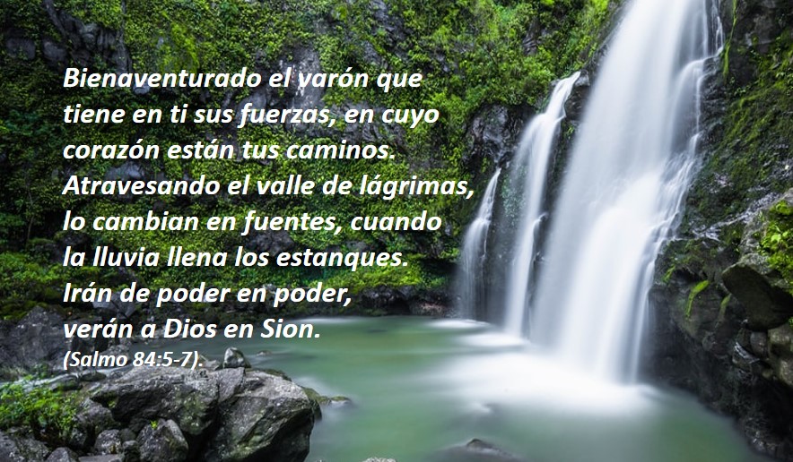 Bienaventurado el varón que tiene en ti sus fuerzas, en cuyo corazón están tus caminos. Atravesando el valle de lágrimas, lo cambian en fuentes, cuando la lluvia llena los estanques. Irán de poder en poder, verán a Dios en Sion (Salmo 84:5-7).